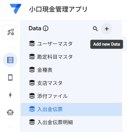 - アプリの編集画面が開いたら、左メニューの[Data](データベースアイコン)をクリックします。
