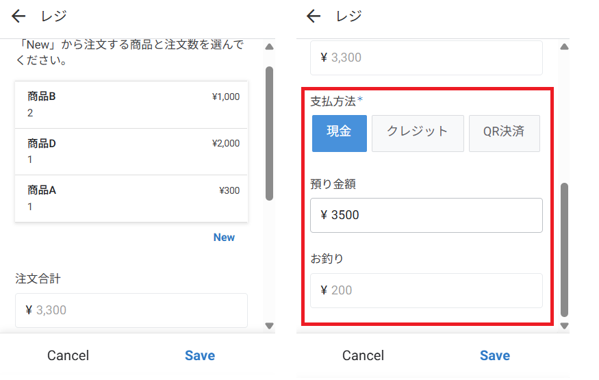 支払方法が現金の場合、預ったお金を入力すればお釣りを自動で計算