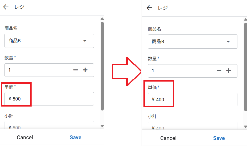 常連さんへの「お友達価格」みたいにその場の判断で安くしたい時も、金額をタップしてサッと変更できます。