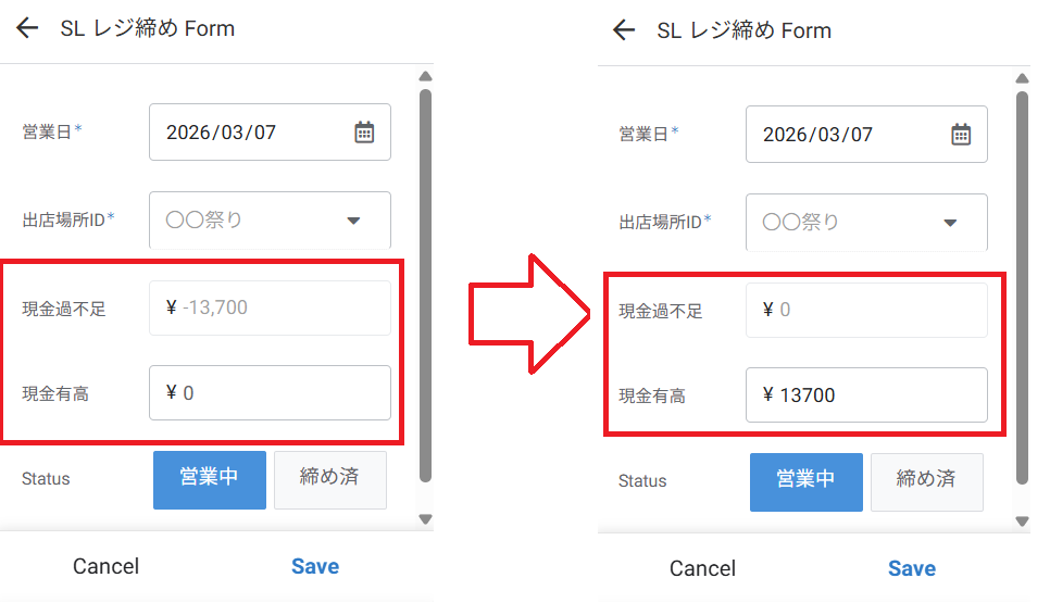 実際の現金を数えて入力するだけで、計算上の数字との差をパッと出してくれます。