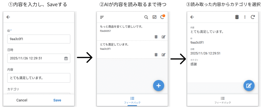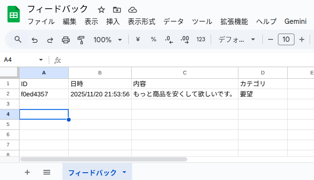 「顧客からのフィードバックをフォームで送ると、AIが内容を読んで『要望』や『クレーム』に自動で分類してくれるアプリ」