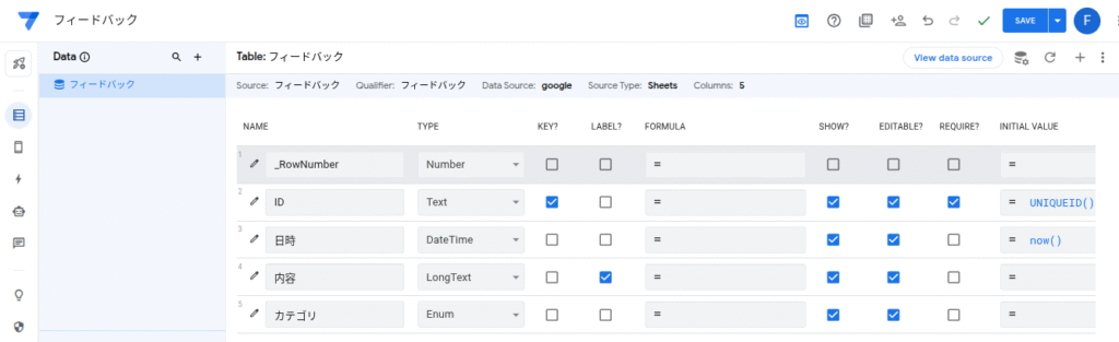 AppSheetエディタのDataからフィードバックをの設定を以下のようにします。