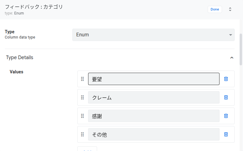 そして、カテゴリ列のEnumのValueに以下の選択肢を追加します。