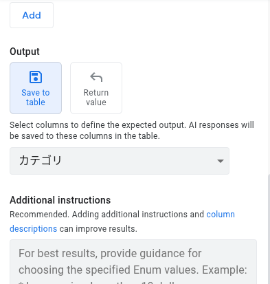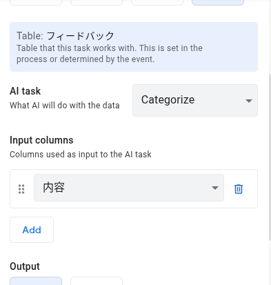 | Categorize(分類) | AI categorizes row information into defined categories | 行の情報を読み取り、定義されたカテゴリに分類します。 |