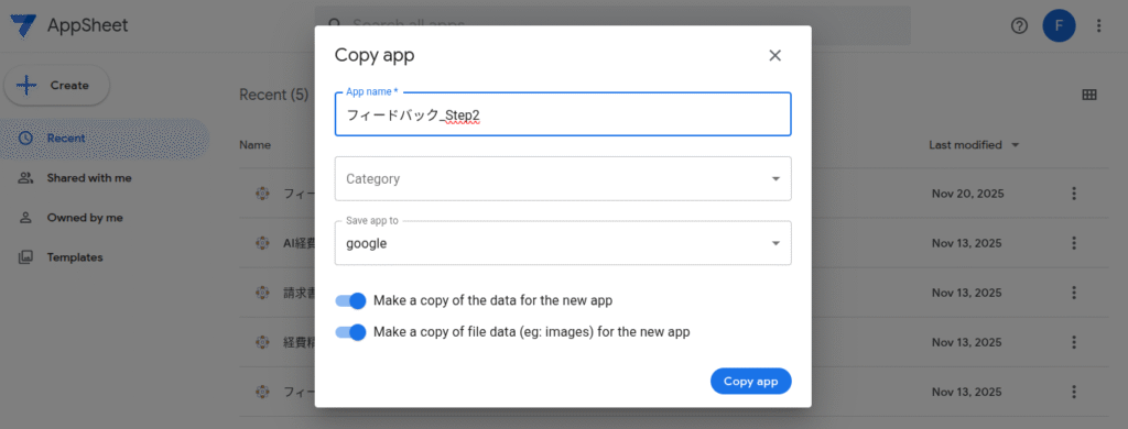 - 「Copy app」をクリックします。