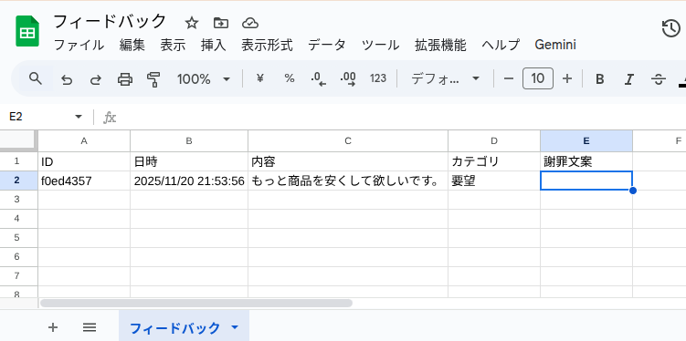 (AIが分類→生成、と2回動くのでステップ1より少し時間がかかります。 - 「フィードバック」シートを確認します。