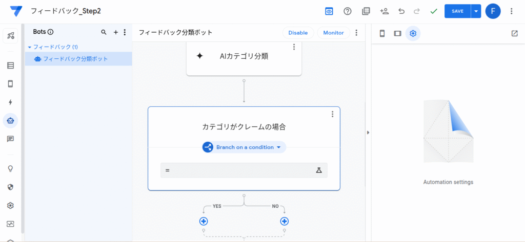 - 左メニューの【Automation】を開き、前回作成した「フィードバック分類ボット」をクリックします。