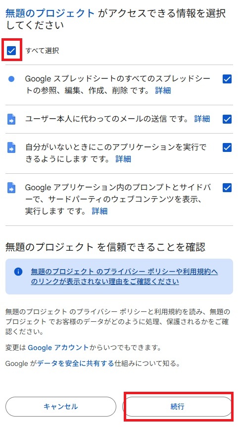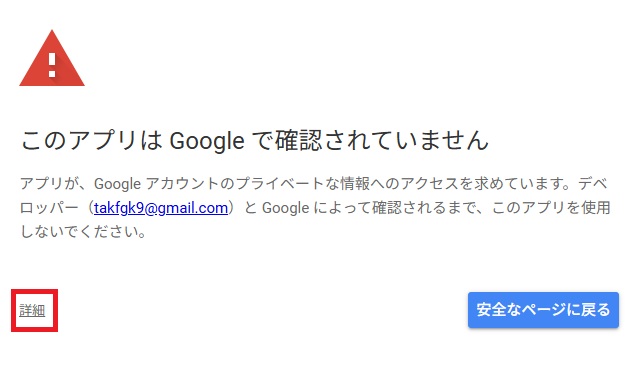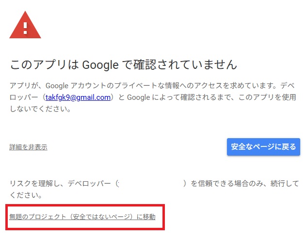 6.(初回のみ)「このアプリはGoogleで確認されていません」と表示されたら、「詳細」→「(プロジェクト名)に移動」をクリックして進めます