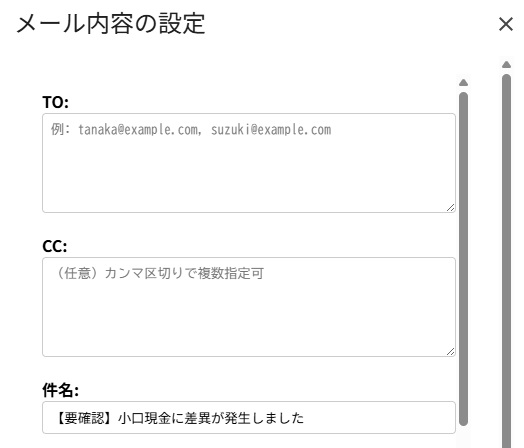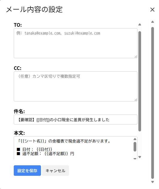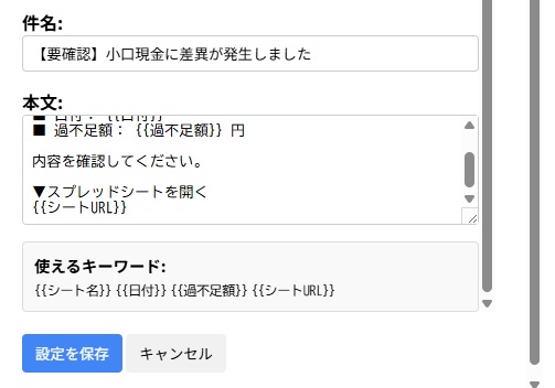 const defaultSettings = { to: '', cc: '', subject: '【要確認】小口現金に差異が発生しました', body: '「{{シート名}}」の金種表で現金過不足が検出されました。\n\n■ 日付: {{日付}}\n■ 過不足額: {{過不足額}} 円\n\n内容を確認してください。\n\n▼スプレッドシートを開く\n{{シートURL}}'};
