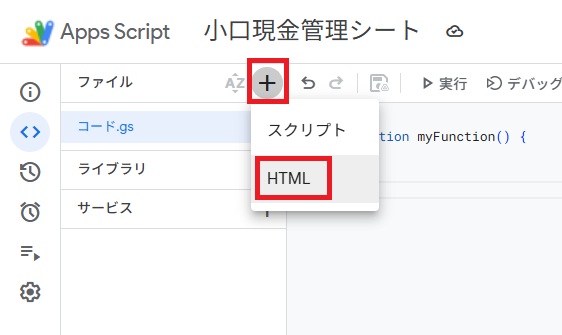 1.STEP1で開いたエディタ左側の「ファイル」の横にある「+」アイコンをクリックし、「HTML」を選択します。