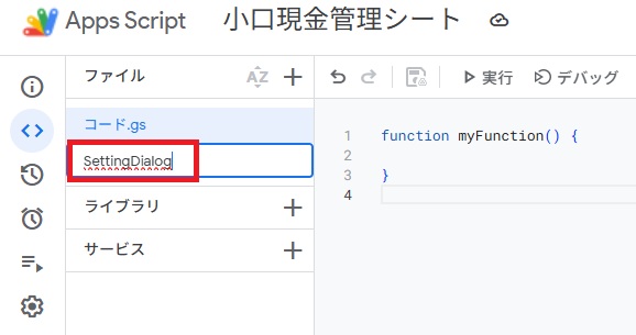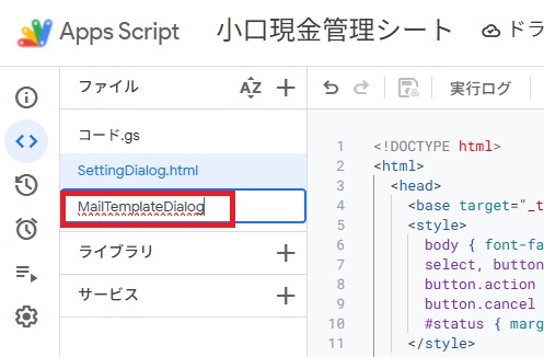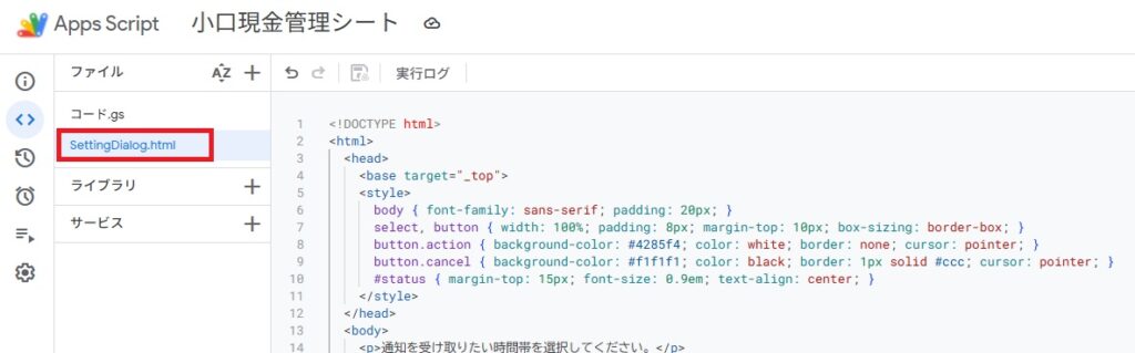 3.新しく作成されたSettingDialog.htmlの中身をすべて削除し、以下のコードをそのまま貼り付けて、保存してください。