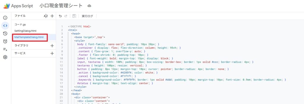 SpreadsheetApp.getUi().showModalDialog(html, 'メール内容の設定');