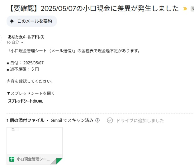 そして、差異があった日には、設定した時刻に以下のような通知メールが自動で届きます。