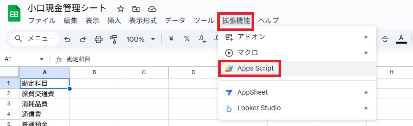 2.上部メニューの「拡張機能」から「Apps Script」を選択します。