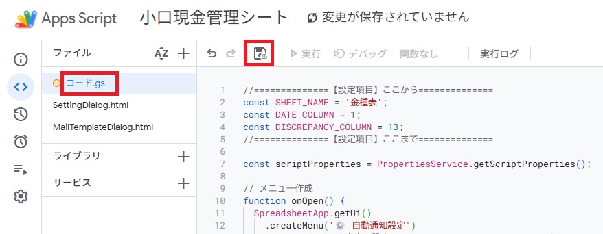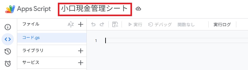 4.スクリプトエディタが開いたら、「無題のプロジェクト」を「小口現金管理シート」に変更してください。