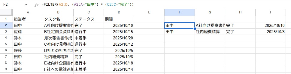=FILTER(A2:D, (A2:A="田中") * (C2:C="完了"))
