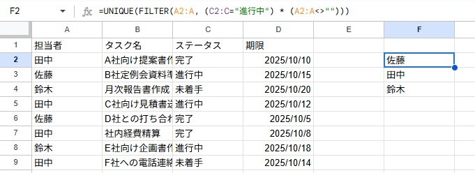 「今、”進行中”のタスクを持っている担当者の一覧を、重複なくリストアップしたい」…そんな時にはUNIQUE関数の出番です。