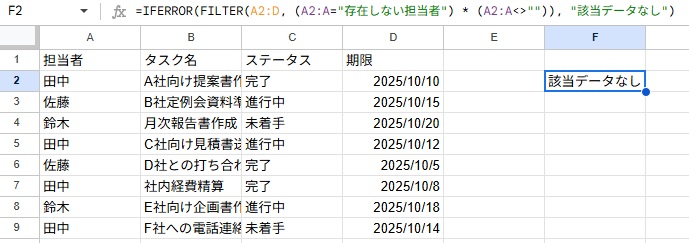 =IFERROR(FILTER(A2:D, (A2:A="存在しない担当者") * (A2:A<>"")), "該当データなし")
