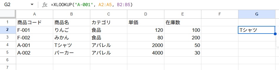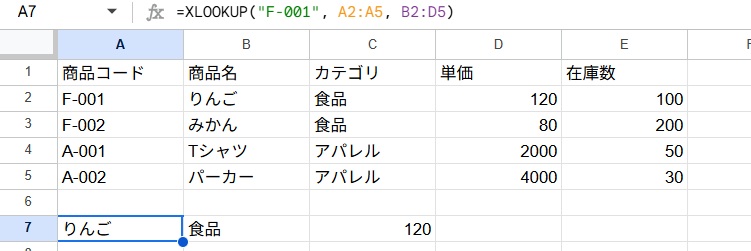 戻り範囲をB2:D5(商品名〜単価)に設定すると、数式を入力したセルから右に向かって「りんご」「食品」「120」が自動的に表示されます。