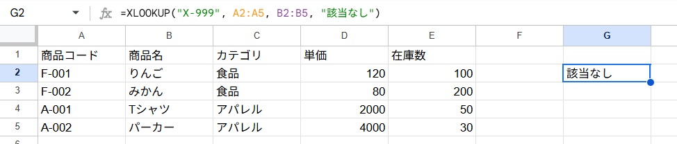 =XLOOKUP("X-999", A2:A5, B2:B5, "該当なし")
