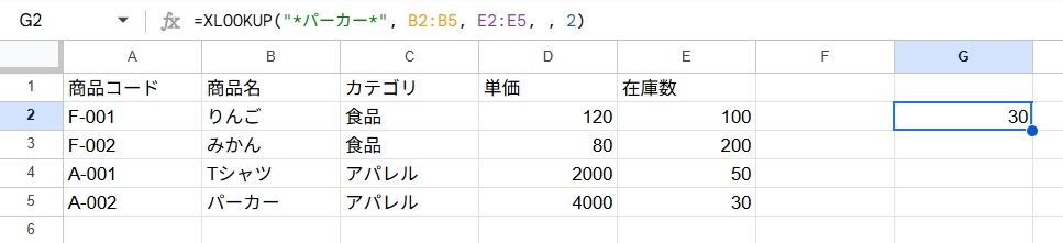=XLOOKUP("*パーカー*", B2:B5, E2:E5, , 2)