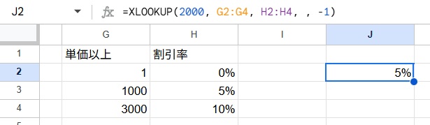 単価「2000円」の割引率を調べるには、以下のように入力します。