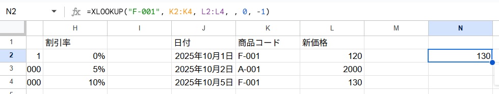 検索モード -1 により、表の下から上に向かって検索が行われ、最初に見つかった(=最も日付が新しい)価格「130」が返されます。