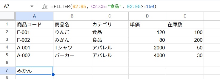 この数式は、「カテゴリが”食品”」かつ「在庫数が150以上」の条件を満たす商品名をすべて返します。